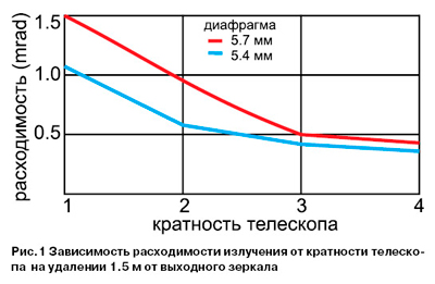 Однако для минимизации влияния расходимости на точность воспроизведения размеров при резке деталей большой площади требуются другие способы. Решение такой задачи, например, для резки листового алюминия, лежит в плоскости использования технических возможностей лазерного излучателя. Применение в виде источника лазерного излучения импульсного лазера фирмы Lasag AG KLS246102 было оправдано с нескольких точек зрения. Мощность излучения, качественная фокусирующая оптика, резонатор с функцией регулировки базы, возможность оперативной замены зеркал разной сферичности позволяют как регулировать диаметр сфокусированного излучения на объекте, так и уменьшать расходимость. Проводились измерения параметров расходимости лазера KLS246102. Данные исследования сведены в рис. 1. График характеризует изменение расходимости в зависимости от оптических параметров резонатора лазера и фокусирующей системы. Представлены параметры неустойчивого резонатора со сферическим задним зеркалом (т.е. формат резонатора с наименьшей расходимостью). Так как входное окно фокусирующей системы более 30 мм, наибольший интерес представляет режим при кратности телескопа равной 4х. При этом легко подсчитать, что на удалении фокусирующей системы от резонатора на 1.5 м уширение диаметра режущего луча составит порядка 4%, что в абсолютных величинах, например, для диаметра луча в 150 мкм составит менее 10 мкм. Этот показатель может считаться практически идеальным для листовой резки.