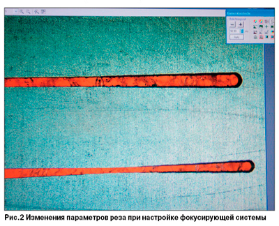 Использование системы Zслежения за профилем листа позволило обеспечить точность фокусировки на его поверхности. На рис. 2 наглядно представлен процесс настройки фокусировки при движении оптической системы с одновременной регулировкой фокусного расстояния. Оптимизация фокусировки велась по минимальной ширине реза и конусности.