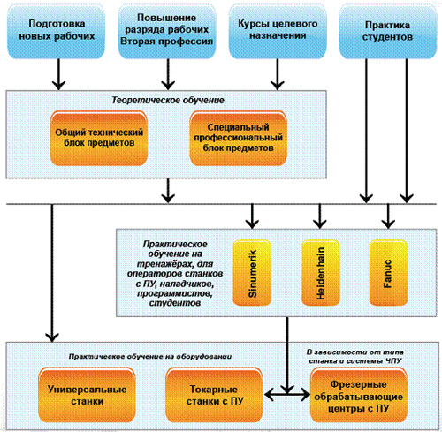 При подготовке новых рабочих полный курс обучения по профессии оператор станков с ПУ, токарь, фрезеровщик составляет 5 месяцев, из них 3 месяца обучение в УЦ и 2 месяца адаптационный заключительный этап обучения в производственных подразделениях на оборудовании цеха. Обучение включает: теоретический курс, обучение на тренажерах, практическое обучение на оборудовании УЦ.