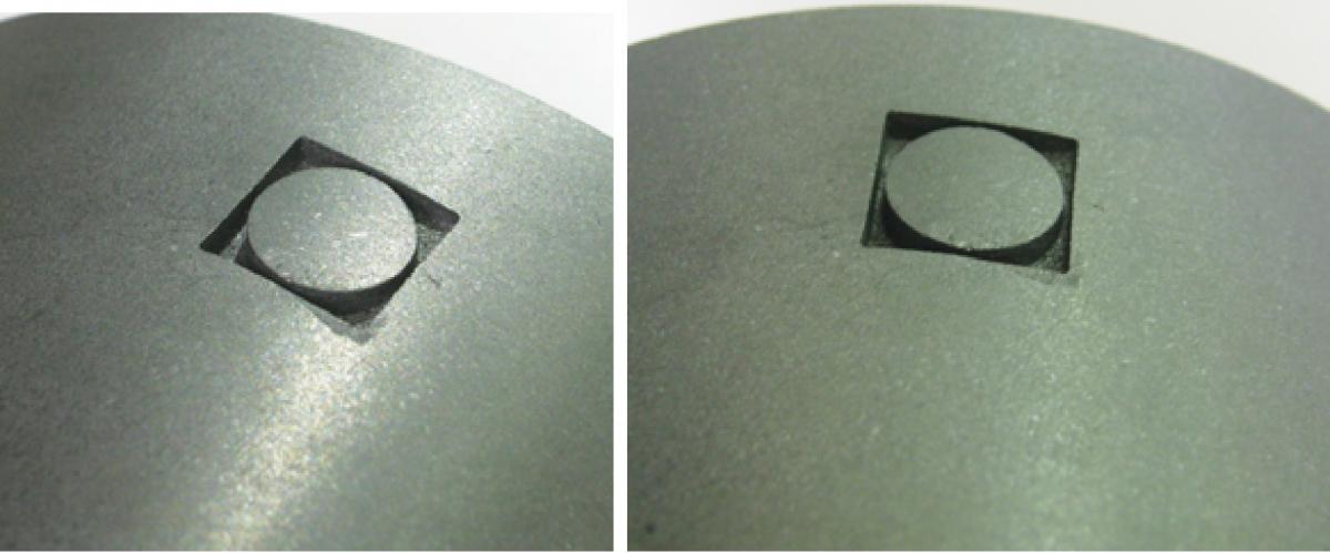 При проведении исследований и отработке технологии выполнения отверстий в изделии из графита, максимальная амплитуда колебаний ультразвукового воздействия увеличивалась от 10 до 60 мкм. При этом получились отверстия высокого качества со стороны поверхности сверления. Однако, по мере увеличения амплитуды и скорости сверления на выходе инструмента из материала на графитовом образце образовались небольшие сколы (рис. 4).