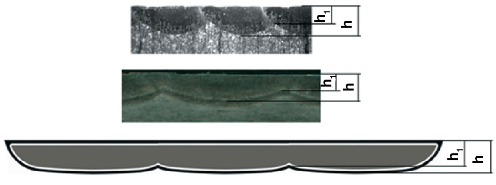 В этом случае часто применяемое выражение «глубина упрочнения» как размер до нижней границы сегмента (h) следует признать некорректным, т. к. за истинную глубину упрочнения правильней считать размер h1 в зоне перекрытия дорожек. Чем меньше разница между h1 и h, тем больше ресурс упрочненной зоны. И он напрямую зависит от коэффициента перекрытия дорожек и от формы упрочненной зоны поверхности детали в поперечном сечении дорожек упрочнения (рис. 10).