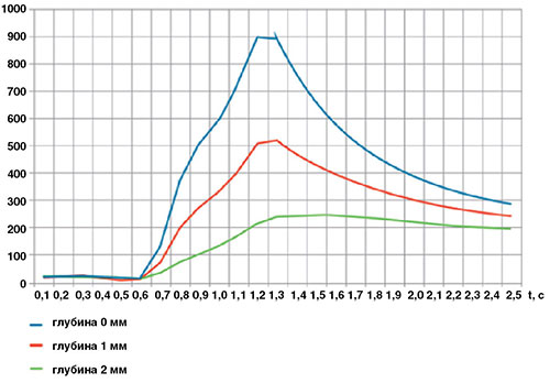 Другие специалисты (физики, оптики, конструкторы) разрабатывают особую (оригинальную) компоновку трубок излучателя многоканального лазера и оптическую систему транспортировки и фокусировки излучения, создающие нужное температурное поле (рис. 12) и обеспечивающие требуемый термический цикл (рис. 13) в зоне обработки. Причем при перемещении пятна излучения по любой криволинейной траектории по любой сложной поверхности (рельефу) в пределах зоны обработки комплекса.