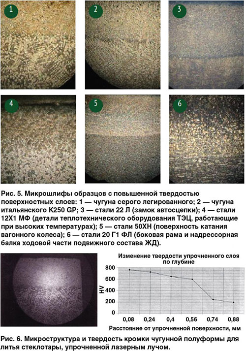 Общеизвестно, что при лазерной обработке при прохождении пятна лазерного излучения по поверхности детали в отличие от любых других тепловых воздействий, происходят эффективные структурно-фазовые изменения в поверхностном слое с образованием мелкодисперсной структуры с повышенной твердостью и износостойкостью (рис. 5, 6). Причины: быстрый нагрев обрабатываемой поверхности и быстрое ее охлаждение, т. е. жесткий термический цикл.