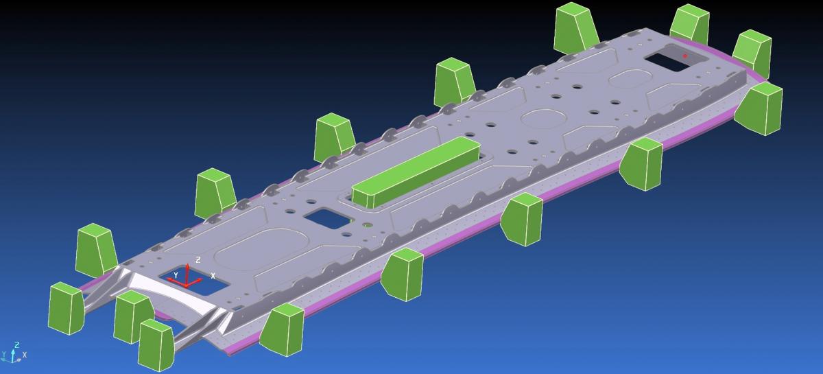Наиболее сложной с точки зрения производства оказалась силовая нервюра (сделанная в виде накладной пластины), служащая для крепления вертикального хвостового оперения к силовому каркасу шасси. Эта деталь сложной формы была изготовлена из цельной дюралюминиевой заготовки при помощи пятиосевой обработки. Созданием управляющих программ в CAM-системе PowerMILL (разработка компании Delcam) занимался инженер-технолог Марк Бриттен (Mark Brittain). Обработка этой детали при помощи традиционных стратегий фрезерования потребовала бы очень много времени, поэтому поставщик инструмента — фирма SGS Carbide Tool (также являющаяся технологическим спонсором проекта) — предложила попробовать использовать новейшую стратегию высокопроизводительной черновой выборки Vortex, подразумевающую применение цельных твердосплавных фрез. Решено было использовать концевую фрезу SGS S-CARB APR с тремя режущими кромками.