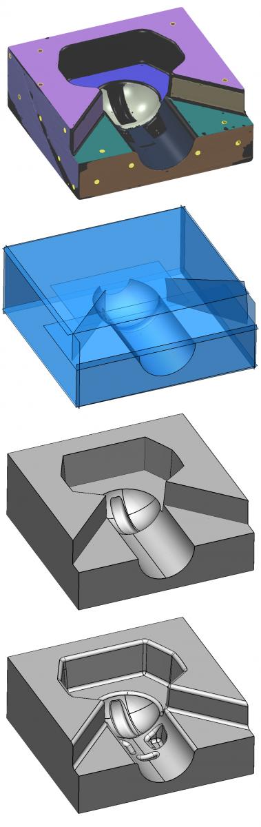Многие специализированные производители технологической оснастки сталкиваются с тем, что импортированные модели изделий из других CAD-систем имеют необоснованно фрагментированные поверхности, что чаще всего связано с преобразованием файла из одного формата в другой. Излишняя фрагментация поверхностей может сильно затруднить технологическую проработку изделия. CAD-система PowerSHAPE Pro позволяет упрощать топологию CAD-модели путем объединения нескольких разделенных фрагментов в одну непрерывную поверхность. Благодаря этому становится значительно проще выполнять операции прямого редактирования и формировать на твердотельной модели литейные уклоны.