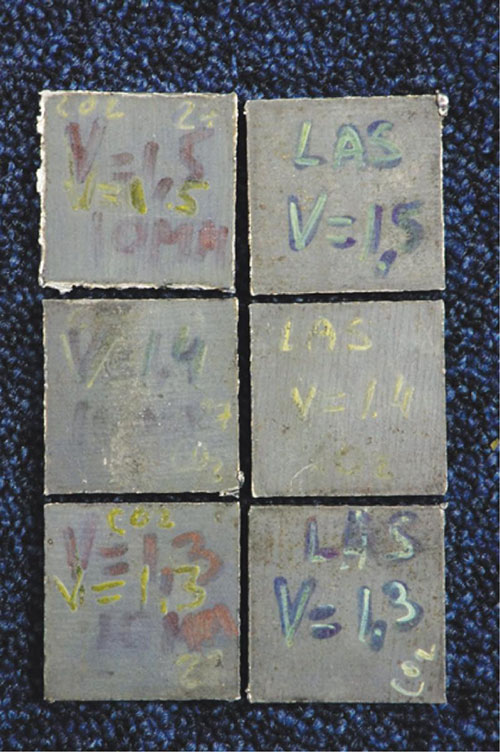 На рис. 1 показана нижняя сторона образцов резки СО2 лазером (1,8 к Вт) стали Ст3 толщиной 10 мм с помощью кислорода 99,7% (столбец А) и кислорода 99,95% (столбец Б). Образцы размещены парами по возрастанию скорости резки от 1,3 до 1,5 м/мин. Тесты проводились в компании ЗАО «Лазерные комплексы», Шатура.