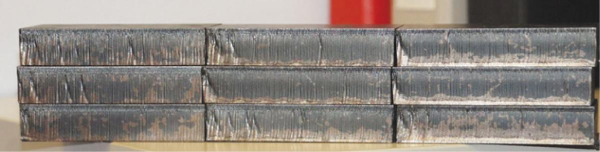 Рис. 2. Образцы резки волоконным лазером стали Ст3, 20 мм. Нижний ряд — кислород 99,7%; средний ряд — 99,95%; верхний ряд — кислород 99,999%.