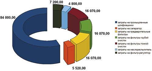 4 машинки х 21 000 руб. + 2 сепаратора х 5 520 + 2 комплекта х 3 фильтра х 8 035 руб. + 2 комплекта по 4 шт. маслораспылителя + фильтра-регулятора (4х (1 200 руб.+1 800 руб.)) = 149 730 рублей.