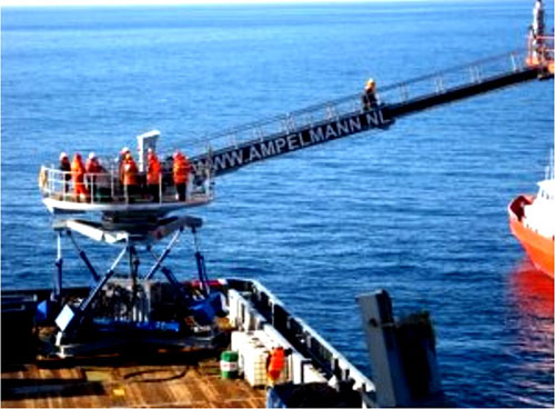 Весьма оригинальный пример применения электрогидравлического гексапода — стабилизатор положения платформы компании Ampelmann, выполняющей шельфовые работы по обслуживанию ветряных двигателей. Здесь для компенсации волнения моря до ± 3 м на палубе обслуживающего судна установлена платформа-гексапод (рис. 10), управляемая в режиме on-line от гироскопического датчика, контролирующего перемещения по трем осям и через систему управления воздействующего на силовые гидроцилиндры таким образом, чтобы верхняя часть платформы сохраняла стационарное положение независимо от перемещений палубы (кстати, — идеальное решение для людей, страдающих морской болезнью).