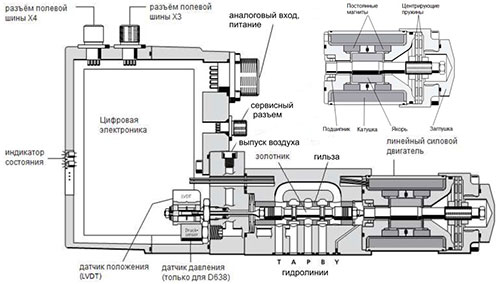 Новейшей разработкой является обширная гамма сервозолотников (в российской терминологии — дросселирующих гидрораспределителей — ДГР) со встроенными цифровой электроникой и интерфейсом. Типичные представители — аппараты D636/D638 прямого управления (рис. 2), оснащенные линейными силовыми двигателями.