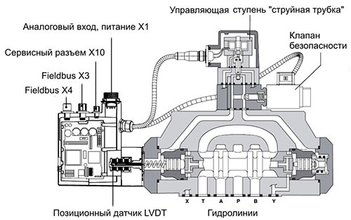 Предусмотрены встроенный интерфейс на базе полевых шин CANopen, Profibus DP V1 или EtherCAT, а также по два аналоговых входа и выхода, причем параметры регулирования можно изменять в режиме on-line. В аварийной ситуации или при остановке рабочего органа плоская пружина линейного двигателя возвращает золотник в безопасную позицию.