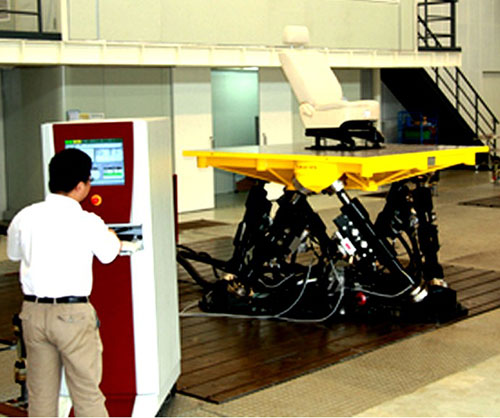 На рис. 9 показано использование аналогичного устройства в стенде для прочностных статических и динамических испытаний кузова легкового автомобиля в отделе исследований и развития центра Kempflo (г. Нанкин, Китай). Платформы-гексаподы широко применяются также для испытаний болидов «Формулы-1».