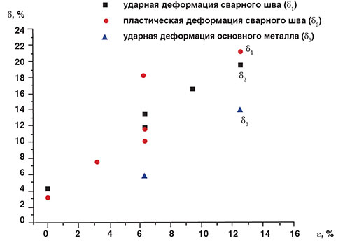 Как мы видим из рис. 4, средние степени упрочнения сварного соединения ?1,2, подвергнутого пластической деформации, имеют более высокие показатели по сравнению со степенью ?3 упрочнения основного металла, подвергнутого ударной пластической деформации.