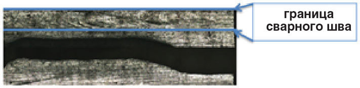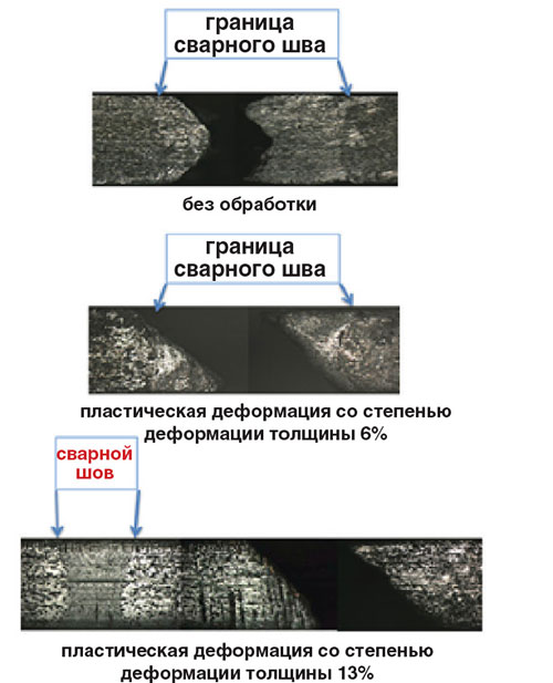 С увеличением степени деформации характер разрушения сварного соединения сравним с характером разрушения основного металла. На рис. 5 при 5-кратном увеличении приведена макроструктура разрушившихся сварных образцов. Стрелками показаны границы сварного шва (вид сбоку) после травления в реактиве Келлера.