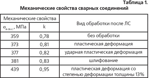 Обобщенные результаты исследования средней прочности сварного соединения от различных видов обработки представлены в таблице 1. Где ?в св. с. – прочность сварного соединения, k = ?в св. с./?в0. — отношение прочности сварного шва к прочности основного металла.