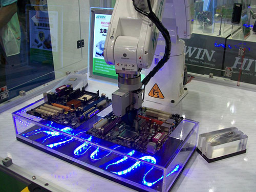 В совершенно новой ипостаси выступила компания Hiwin, занимавшая огромный стенд. Компанию доводилось видеть на выставках в Москве, Ганновере, Штутгарте, и везде главной продукцией этого известного поставщика компонентов выступали системы линейного перемещения — каретки, направляющие, рельсы Hiwin, линейные подшипники, муфты и шарико-винтовые пары. На домашней выставке Hiwin под девизом «Эра интеллектуальной автоматики» погрузил нас в царство робототехники на основе компонентов компании. Конечно, танцующие под музыку ряды роботов — это эффектно, но невозможно также отвести глаз от робота, компонующего компьютерные платы, а также роботов для медицинских целей, прошедших европейскую сертификацию. По мнению сотрудников компании, роботы Hiwin могут найти применение в полупроводниковой, аэрокосмической, энергетической промышленности, и это не предел.