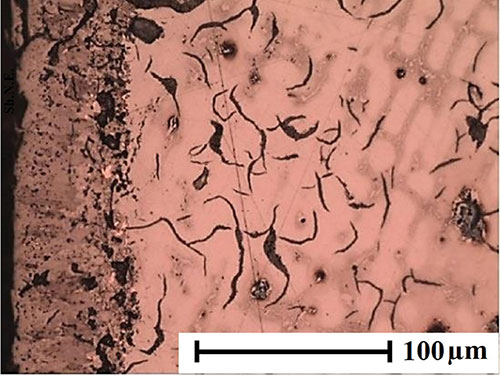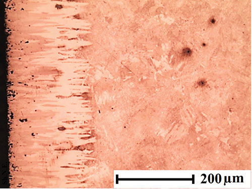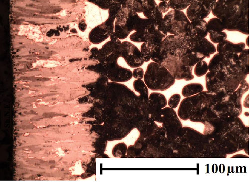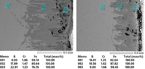 Поверхностная зона отвечает бориду FeB (1800…2200 HV0,1), под которым располагается зона боридов Fe2B (1500…1800 HV0,1).