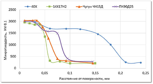 Рис. 2. Микротвердость боридных слоев после борирования в расплаве Rubor 1 при 950°С в течение 4 часов.