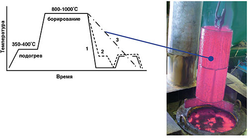 Рис. 4. Технологическая схема жидкостного борирования с последующей термообработкой: закалка (1), закалка с изотермической выдержкой (2), охлаждение на воздухе (3).
