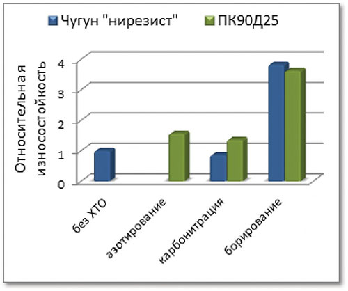 Сравнительные испытания различных видов диффузионных покрытий со штатной технологией, включающей изотермическую закалку, показывают 4-кратное повышение износостойкости при трении металл по металлу в присутствии абразива как для пар трения, изготовленных из чугуна, так и из порошкового материала (рис. 5).
