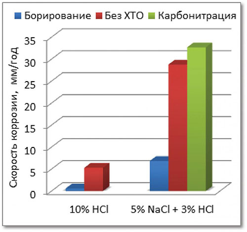 Коррозионная стойкость борированного слоя в специальных средах, имитирующих пластовую жидкость (водный раствор 5% NaCl+3%HCl) и жидкость для промывки насосов (водный 10% раствор HCl) – повышается в 4 и 10 раз соответственно (рис. 6).