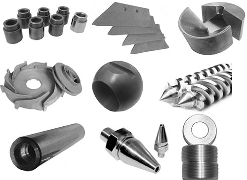 Рис. 7. Примеры применения технологии жидкостного борирования: втулки ступеней ЭЦН, лемеха плугов, экструзионные матрицы, направляющие аппараты центробежных насосов, запорно-регулирующая арматура, шнеки экструдеров, плунжеры насосов, сопла горелок, резьбонакатной инструмент и другие.
