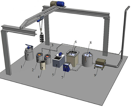 Рис. 8. Технологическая линия жидкостного борирования: 1 — печь подогрева, 2 — печь — ванна борирования, 3 — печь — ванна подстуживания, 4 — емкость с закалочной жидкостью, 5 — печь — ванна изотермической выдержки, 6 — ультразвуковая мойка, 7 — бак ополаскивания, 8 — накопитель промстоков, 9 — испаритель промстоков.