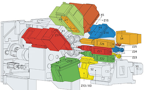 Спустя несколько лет перед компанией TORNOS встала задача еще больше увеличить производительность обработки, и в 2009 году эволюция станков DECO воплотилась в выпуске новой серии – EvoDECO (рис. 3). Эволюция заключалась в инновационных на тот момент синхронных приводах обоих шпинделей, позволивших повысить производительность обработки за счет большей динамики разгона/торможения шпинделей и постоянно высокого крутящего момента. Кроме того, держатели инструмента получили новую конструкцию с увеличенным количеством позиций для установки режущего инструмента. Во время работы EvoDECO четыре режущих инструмента способны одновременно вести обработку в зонах главного шпинедля и противошпинделя.