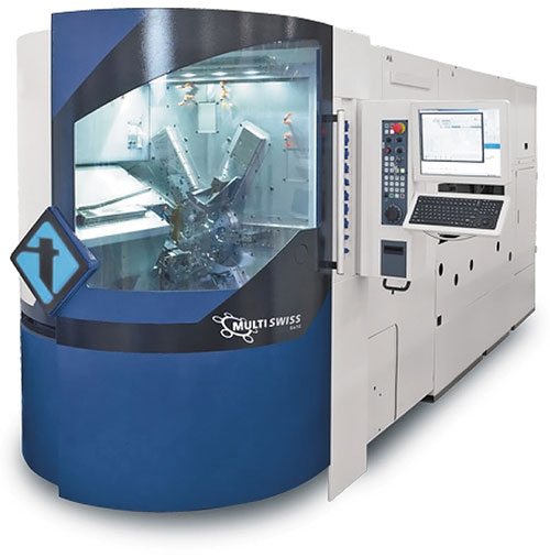 Моношпиндельные станки с подвижной передней бабкой и направляющей втулкой позволяют обрабатывать детали с длиной, значительно превышающей их диаметр. Мульти-шпиндельные станки, наоборот, имеют жесткие ограничения по длине обработки. В таких условиях логичным стало появление мультишпиндельного станка для производства деталей, которые должны обрабатываться с использованием технологии продольного точения. В 2011 году на выставке EMO в Ганновере был продемонстрирован революционно новый станок MultiSwiss (рис. 5). Он оснащен 6 шпинделями, каждый из которых имеет продольные перемещения, а также противошпиндель для доработки деталей с тыльной стороны. Система ЧПУ контролирует 14 линейных осей и 7 осей С. Для удобства работы наладчика предусмотрены: расширенный доступ в рабочую зону станка; програмное обеспение TB-DECO, которое позволяет быстро запрограммировать станок и проверить траектории всех органов в виртуальном режиме до начала реальной обработки. Помимо всего прочего, MultiSwiss восхищает своей компактностью, не характерной для аналогичных станков. Все периферийные устройства (податчик прутка, бак для Сож, станция охлаждения и фильтрации СОЖ, гидростанция и т.д.) размещены внутри единого корпуса и имеют удобный доступ для обслуживания.