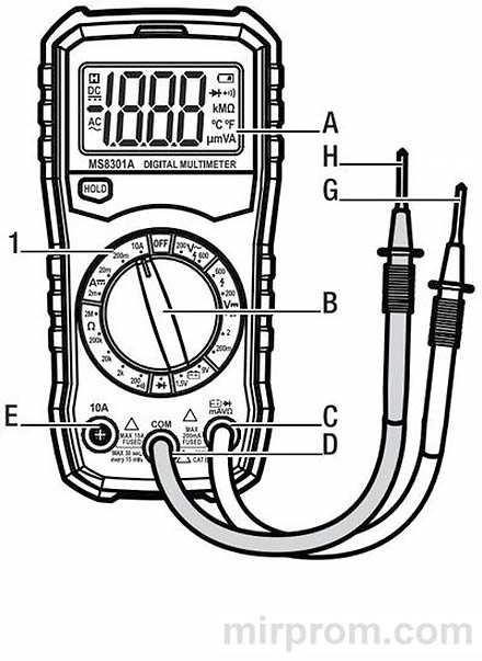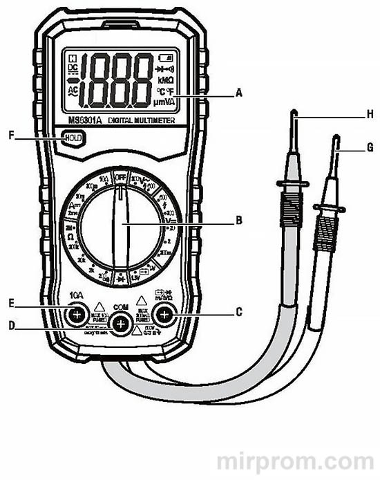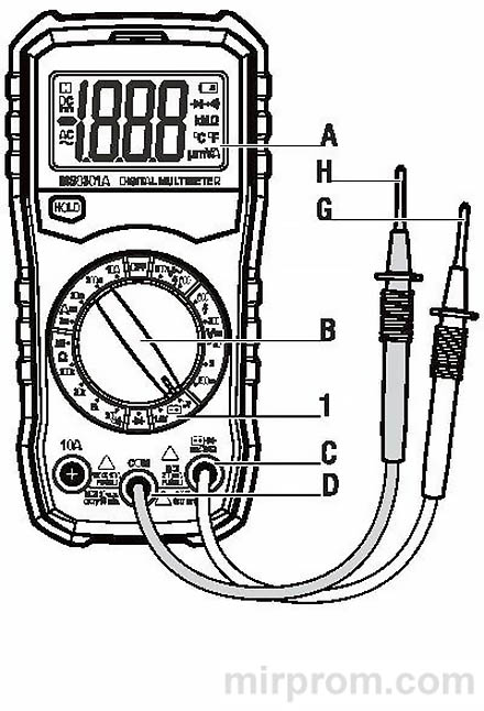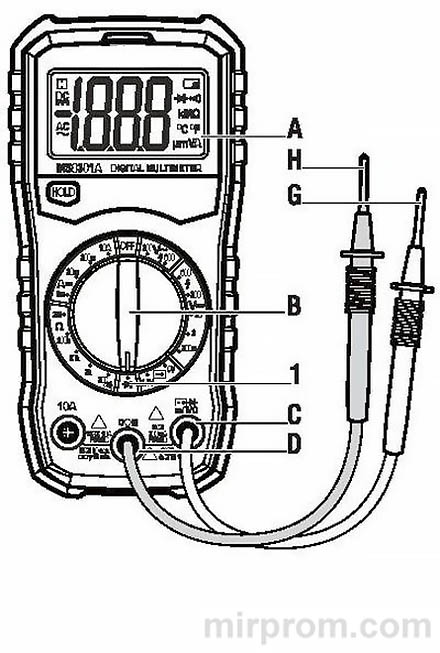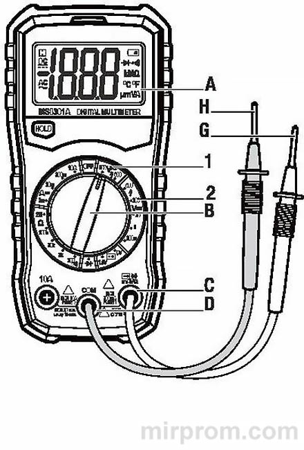 - Connect the test leads (H and G) to the circuit being measured and read the value on the LCD display (A).