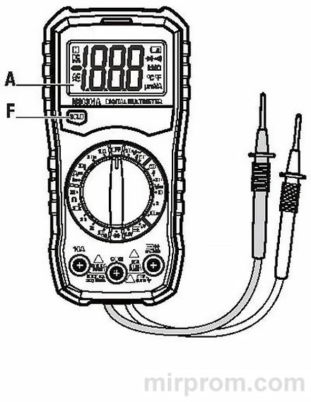 - Press the Hold button (F). This fixes the LCD display (A) on the current value and an H Is displayed.