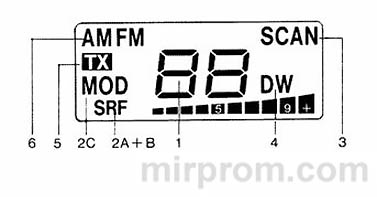 В режиме передачи на дисплее появляется надпись "RF". В Вашем JC-2204 имеется 10-сегментный индикатор уровня модуляции на панели ЖК-дисплея. При передаче, после нажатия на тангенту, на дисплее появляется надпись "MOD" и индикатор модуляции показывает глубину модуляции.